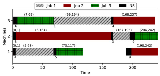 The detailed Gantt chart of the optimal solution found for the instance problem; blocking CJSS problem with sequence-dependent nonanticipatory setups (NS).