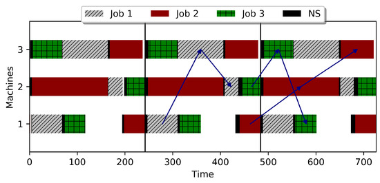 The Gantt chart of three consecutive cycles for the considered instance problem; blocking CJSS problem with sequence-dependent nonanticipatory setups (NS).