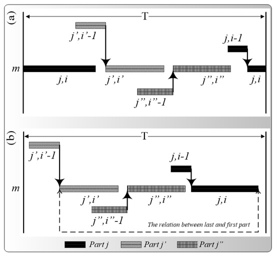 In addition, due to the cyclic scheduling, the relations between the cycles are established by the occupied machines at the start of the cycle. Actually, there is a cyclic sequence between the parts on each machine. To schedule the operations of all the parts in one cycle for each machine, the sequence of parts on each machine is considered to be determined based on the preceding and successor parts. The binary variable X determines the preceding and successor of all the parts on each machine. Thereupon, as illustrated in Figure 10, the first part in the next cycle is the successor of the last part in the present cycle.
