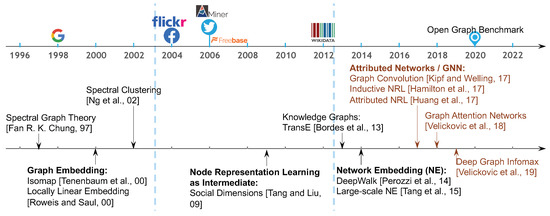 In the early 2000s, as illustrated in Figure 1, NRL was known as graph embedding [17,18,19], which was mainly used to perform dimensionality reduction for feature vectors. Its core idea can be summarized as two steps. First, given a set of instances, such as documents or images of faces, associated with feature vectors, we construct a new graph to connect all instances. Its edge weight is set as the shortest path distance [18], reconstruction coefficient [20,21], or similarity [17] between nodes i and j in the feature vector space. Second, we apply multidimensional scaling [18] or eigen decomposition to the adjacency matrix or its variation [17,20]. In such a way, the learned node representations can be employed as the latent features of instances. It has been proven that most dimensionality reduction techniques, such as principal component analysis and linear discriminant analysis, could be reformulated as graph-embedding processes with constraints [19]. Meanwhile, efforts have also been devoted to utilizing NRL as an intermediate process to conduct clustering [22,23,24], known as spectral clustering. Its key idea is similar to graph embedding [19]. Based on feature vectors, we construct a new network depicting similarities between instances, and then calculate the eigenvectors of the graph Laplacian matrix of this new network. The learned eigenvectors serve as the latent representations of instances. To predict the clusters, a traditional clustering algorithm such as k-means is applied to the eigenvectors.