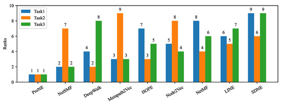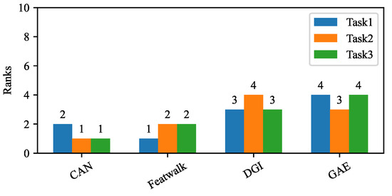 The overall ranks of all four unsupervised NRL methods for attributed networks are summarized in Figure 4, which are computed based on Equation (2). Their results in Task 1, Task 2, and Task 3, are summarized in Table 6, Table 7 and Table 8.