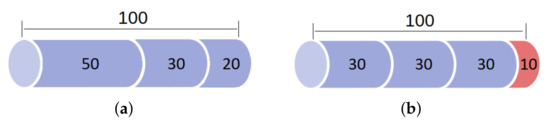 Examples of cutting patterns. The items are drawn in blue and the cut loss is drawn in red. In (a), we illustrate the cutting pattern with cut loss equal to 0 and, in (b), the cutting pattern with cut loss equal to 10.