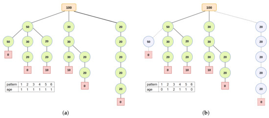 In the representation of reduced instances of the problem, each position in the array is associated with a cutting pattern in the search tree. The cutting patterns considered in the reduced instance present a value greater than or equal to 1 (one) in the array and are highlighted in green in the search tree. In (a), we illustrate a reduced instance with all cutting patterns from the search tree and, in (b), a reduced instance with only 4 cutting patterns.
