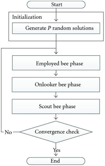 The search agents in ABC look for the optimal solution by mimicking the foraging behavior of honeybees. The bees are grouped as employed, onlooker, or scout bees. They work with each other when looking for a food source with abundant nectar. The food source and nectar are analogous to the optimization solution and its fitness or quality. The optimization solution search process can be divided into four phases: initialization, employed bee phase, onlooker bee phase, and scout bee phase. The employed, onlooker, and scout bee phases are iterative processes that are repeated until the stopping condition is satisfied. The stopping condition could either be a maximum number of iterations or the ideal fitness or minimum error. In this research, the maximum number of iterations is adopted as the stopping condition. The general flowchart of the ABC algorithm is shown in Figure 1.