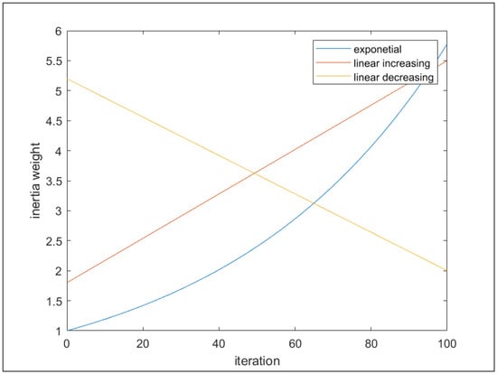 where is the iteration number, and is the maximum iteration number. On the other hand, the linear inertia weight is calculated using Equation (3).