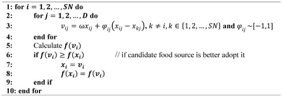 Figure 3 shows the pseudocode for the employed bee phase. For each of the food sources the new candidate food source, , is generated using Equation (1) (line 3 in Figure 3). The fitness of the new candidate food source is then evaluated and if it is better than the current food source, , it is adopted as the food source of the agent.