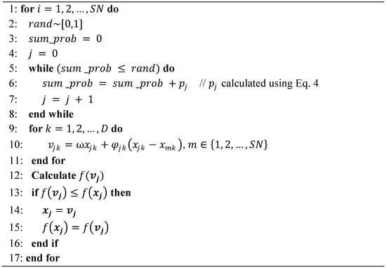 The pseudocode of the onlooker bee phase is shown in Figure 4. The phase starts with the selection of the random threshold value, . This value is then compared with the sum of the probability calculated using Equation (4). The food source with a sum probability of more than the random threshold is selected and the candidate food source is calculated using Equation (1). Similar to the employed bee phase, if the new candidate food source is better it is adopted.