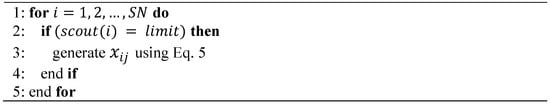 The pseudocode in Figure 5 is the algorithm of the scout bee phase. The “” is an important parameter that decides when a food source is abandoned after no improvement for the predetermined number of iterations. The abandoned food source is replaced using Equation (5).