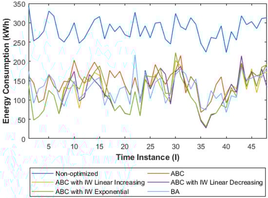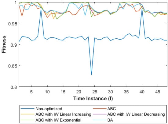 The fitness of the optimization algorithms over the 48 time instances are illustrated in Figure 6. The optimization algorithms are able to improve the fitness value. As shown in the graph, after optimization using exponential the IW-ABC (green), linear increasing IW-ABC (orange), linear decreasing IW-ABC (purple), ABC (red), and BA (sky-blue), all the fitness values are above the dark blue line, which is the fitness value before optimization. The IW-ABC with linearly decreasing inertia weight provides the highest fitness value in comparison to the other algorithms in most of the time instances as can be seen from the purple line in the figure.