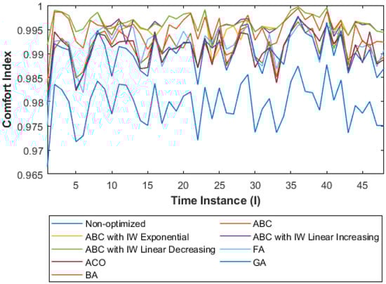 The user comfort index of the optimization process is shown in Figure 7. The optimized comfort index values regardless of the optimizer used are constantly better than the comfort index value of the non-optimized system shown by the dark blue line. This shows the optimization algorithms are able to optimize the user comfort index. However, among all the algorithms, the three variants of IW-ABC (exponential in orange, linear decreasing in green, and linear increasing in purple) show better performance where the lines are closer to 1. The BA (apricot) and FA (sky-blue) are close to the proposed variants of IW-ABC. Meanwhile, the ABC (red), ACO (maroon), and GA (blue) perform worse but are, nonetheless, better than without optimization. The fluctuation of the comfort index is influenced by the fluctuation in the environment.