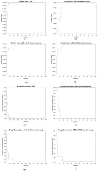 The convergence of the comfort index and energy consumption of the IW-ABC with exponential, linear increasing, and linear decreasing are compared with the original ABC in Figure 9. It could be observed (Figure 9a,e) that the original ABC suffers from fast convergence and imbalanced exploration and exploitation. The original ABC started to converge even before the 10 th iteration.