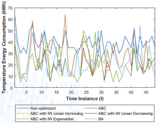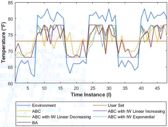 Figure 10 shows the environmental temperature, user set temperature, and the optimized temperatures according to the algorithms. The optimized values oscillate within the bounded limit of [68 °F, 78 °F] and all are in between the environmental temperature value (dark blue) and approaching the user set value (red). The oscillation is influenced by the change of the environmental temperature. The optimizers aim to minimize the error difference between the optimized temperature and user’s preference so that the comfort index is maximized, while at the same time reducing the difference of the optimized temperature with the environment so that the energy usage is reduced. The energy consumption in optimizing the temperature is shown in Figure 11. The energy required for the system using optimized temperatures are lower than the non-optimized system in most of the settings. The exponential IW-ABC (in green) is observed to contribute to lower energy usage.