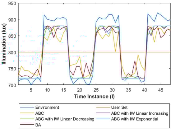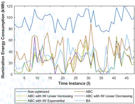 For the illumination parameter optimization, the results are shown in Figure 12. Similar to the temperature, as the optimizers balanced between the comfort index maximization and power consumption minimization, the optimized illumination values obtained are between the environmental value and the user’s demand. The optimized illumination was also in the predefined limit. Figure 13 shows the required energy of illumination. The optimized energy consumption is lower than the non-optimized system for all time instances. Thus, the required energy consumption of the lighting system is successfully reduced using the optimization system. The IW-ABC with linear decreasing inertia weight (in purple) found the best illumination level with the lowest energy usage.