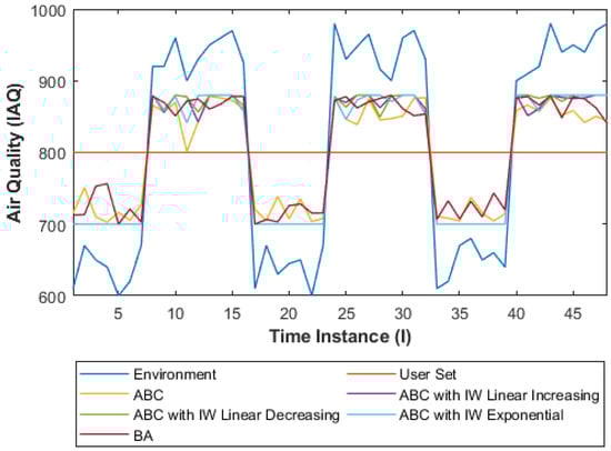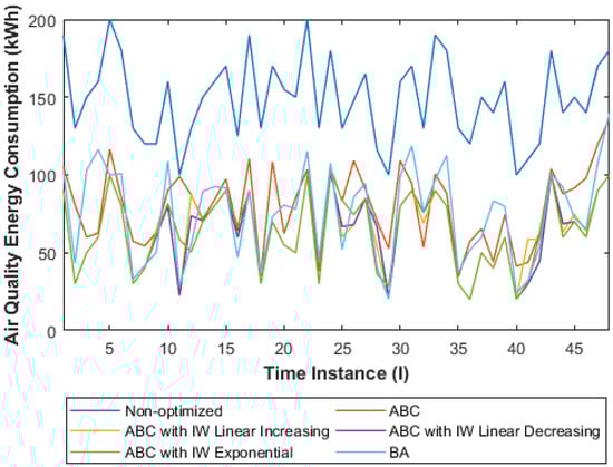 The optimized air quality with respect to the environmental and user preferred air quality are shown in Figure 14. The optimized air quality values are in between the environmental value, the user set value, and the limit of 700, 880 IAQ. The optimized air quality compromises between the comfort index and energy consumption. Figure 15 shows the required energy for air quality optimization. The ventilation system requires lesser energy after optimization. Moreover, the three variants of IW-ABC offer better energy efficiency than ABC and BA.