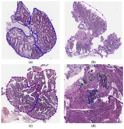 Examples of labelled hematoxylin- and eosin (H and E)-stained colorectal tissue slides stained with the labelled hematoxylin and eosin (H and E) of different classes: (a) tubular adenoma (TA); (b) villous adenoma (VA); (c) well-differentiated adenocarcinoma (AKG1); (d) poorly differentiated adenocarcinoma (AKG3).