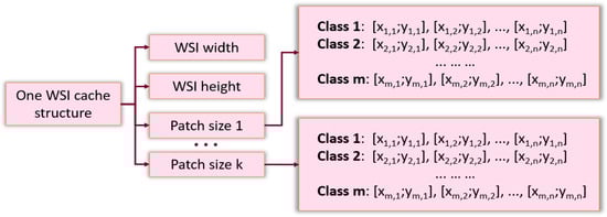 Splitting WSIs into patches and saving them to a separate file was time consuming for a large database of images. This procedure had to be repeated when the size of the patch was modified. The caching system overcame these issues. This system was implemented in the form of an associative array, which for each WSI, stored metadata: image dimensions and lists of the coordinates of the patch in the source image for each class, depending on the desired size of the patch (see Figure 2). Upon training and testing, the patches were read directly from the original WSI according to the desired size and the coordinates stored in the cache.