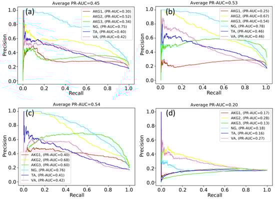 According to Figure 4, the classification quality of some classes increased or fluctuated (NG and AKG2 classes), while the classification quality of other classes decreased (for example, TA and VA classes). As a result of many experiments, it was not possible to find out the optimal number of training iterations maximizing values of PR-AUC simultaneously for all classes.