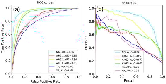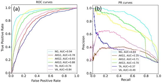The quality of EfficientNet-B4 prediction for all classes: (a) the ROC-AUC metric and (b) the PR-AUC metric.