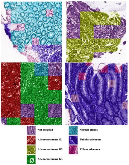 Our study clearly showed the complexity of differential diagnosis between the structures of tubular adenoma, villous adenoma, and well-differentiated adenocarcinoma in conditions of insufficient data of these classes. The initial growth of highly differentiated adenocarcinoma often occurs in tubular and villous adenoma, and when pathologists label these H- and E-stained structures and face them with transition areas, they assign an uncertain class. Other structures do not cause an ambiguous interpretation by different specialists. This issue could be solved by multiple validation of the same WSI labelling by several specialists.