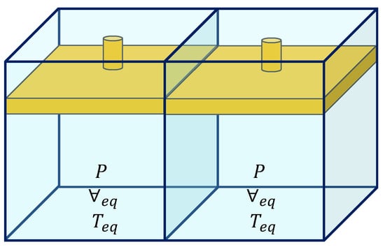 After the systems are coupled, heat exchange and work are performed, resulting in the changes in the temperature and the volume of the systems. If we consider the two systems as two cylinders side by side, the temperature and volume are different, but the pressure is the same in both systems (Figure 2). Additionally, the pistons in both systems are free to move, so each system can perform either positive or negative work. In each thermodynamic process, the pressures in both systems are equal.