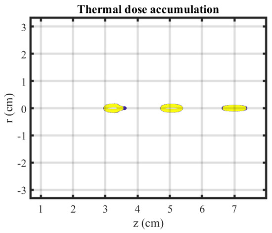 Thermal doses of 240 min at 43° Celsius irreversibly destroy and coagulate vital cellular protein, tissue structural components, and the vasculature, leading to rapid tissue death [1]. In Figure 6, the region where the dose exceeds 240 CEM43 is marked by yellow bar. Note that the threshold may vary depending on the kind of tissue.