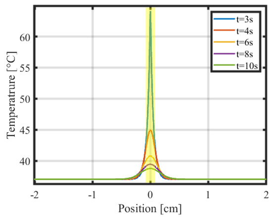 Following sonication, the primary focus axis was subjected to temperature measurements every 2 s (see Figure 6). The temperature distribution in space is Gaussian when a major blood artery is absent. The temperature drops from a peak of around 65 °C at the end of the sonication phase to about 38 °C at the end of the cooling phase. On the other hand, the surrounding region with temperatures above 37 °C is progressively expanding.