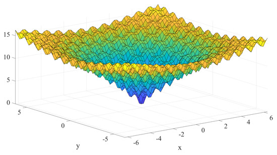 For , a 3D plot of the function is shown in Figure 7. The global minimum of the function in interval is located at and the cost of 0.