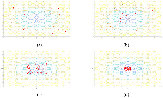 In the optimization process using TEA, the initial population of 100 systems was chosen in Figure 8a. Every coupled system individually explored the minimum point. The systems are indicated by × marks. Figure 8b–d show the movements of systems at iterations 17, 34, and 50. It can be seen that at iteration 17, while most of the systems were located at local minima of the function, a couple of them had reached the global minimum point, at which the best cost is . At iteration 34, although a couple of systems were trapped, the majority of them reached the equilibrium and the best cost was . At iteration 50, almost all systems had reached the optimal location. The final answer was , which is very close to zero.