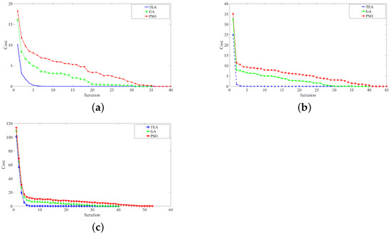 Problems and are Sphere function and Rosenbrock function, respectively. The minimum cost against the iteration for and achieved by TEA are compared with those by GA and PSO, as shown in Figure 9b,c, respectively. Both of the plots indicate that TEA performed best, followed by GA and PSO.