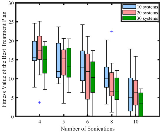 In Table 3, given that the medians of both measures are zero for 8 and 10 sonications, regardless of the number of systems, it can be inferred that more than fifty percent of runs resulted in flawless treatment plans. The comparison between Table 3 and Table 4 indicates that in most circumstances, it was easier to completely cover the treated area than to completely protect the normal tissue. Energy seeping from the focus point (heat diffusion) to the protected zone was the cause of mistreatment.