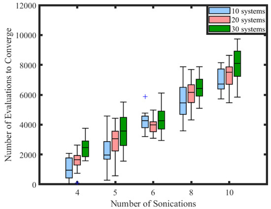 Number of evaluations to reach convergence for various numbers of sonications and systems.