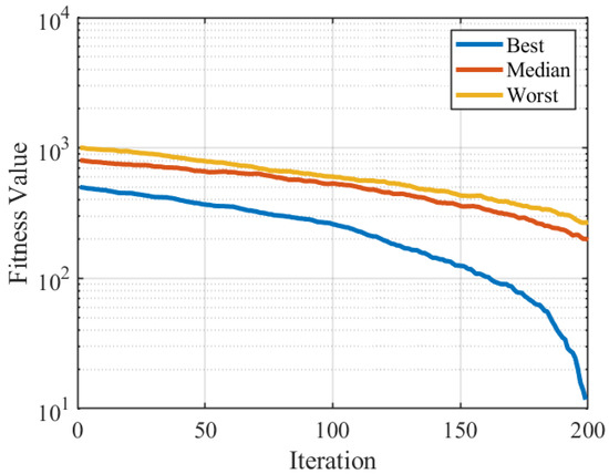 Finally, the development of the TEA is looked at by tracking the evolution of the finest system. On a logarithmic scale, Figure 13 depicts the statistics of the evolution of a best system over the course of 15 separate runs, each of which had 8 sonications and 20 systems. It can be observed that a normal run converges very quickly, with 200 iterations generally sufficing.
