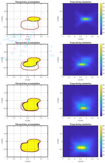 The illustration of the ideal treatment strategy with four sonication cycles is shown in Figure 14. In the order they appear in the treatment plan, each row in Figure 14 corresponds to each sonication out of four sonication cycles. The left column depicts the lesion map (yellow region), namely the places where has surpassed 240 min. In this column, the red line shows the boundary of the area which must be treated properly. After sonication, the actual temperature distribution of the domain is shown in the right column (including the cooling phase). It can be observed that some of the energy from prior sonications had not yet dissipated, but was utilized to increase the temperature by subsequent sonications. In Figure 14, the whole target area is ultimately covered.