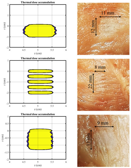 Next, the numerical HIFU treatment was evaluated three times with the actual HIFU experiments on chicken breast. The results of the three trials are shown in Figure 15. The left column shows the shape of lesion patterns based on the numerical simulation. The right column demonstrates the actual treated region after the HIFU irradiation. Each experiment consisted of five sonications and a one-second cooling cycle. The distances between sonications were set to 3 mm, 5 mm, and 3 mm, and the heating time was set to 3 s, 3 s, and 2 s, respectively. Even though there are a few tiny patches of tissue that have not received the intended dosage of 240 , comparisons of the planned and actual treated regions indicate excellent agreements.