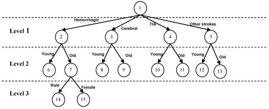 PHTST is constructed by recursively partitioning nodes into more homogeneous subgroups based on covariates representing patient characteristics such as age, gender, and disease diagnosed. A split, minimising WIC is selected to partition the node into child nodes at each branch. If no split improves WIC, the node is designated as a terminal node. Figure 2 is the schematic representation of the phase-type survival tree constructed using the WIC-based splitting criteria for the length of stay data on stroke patients from the Belfast City Hospital. Table 1 lists nodes of the tree and possible splits of these nodes. The total value of WIC for all the terminal nodes of the survival tree is 16,478.75, and the total improvement in the WIC is 368.98. For the root node, WIC is 16,847.73.
