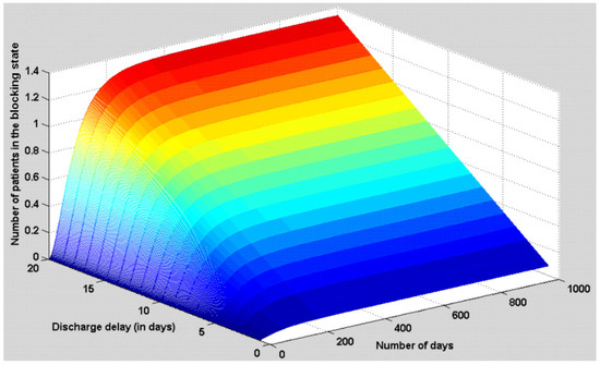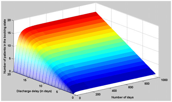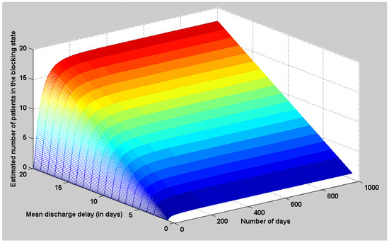 Figure 5. The estimated total number of patients (with respect to the mean discharge delay and the number of days) in the blocking state.