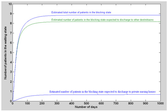 Figure 6. The estimated number of patients in the blocking state with each expected discharge destination for a mean discharge delay τ = 10 days.