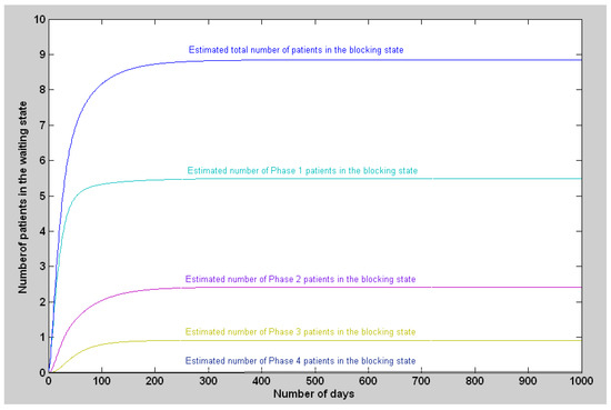 Figure 7. The estimated number of patients in the blocking state from each phase for a mean discharge delay τ = 10 days.
