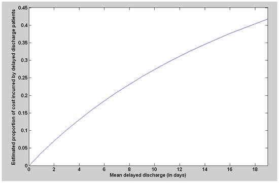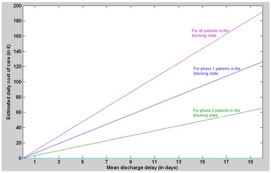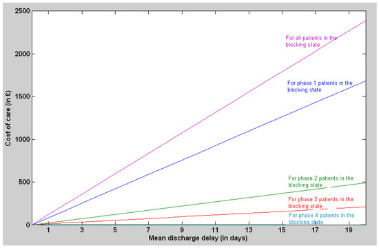 Figure 17 and Figure 18 show that the estimated number of patients in the blocking state and, therefore, the daily cost of care of patients in the blocking state expected to be discharged to private nursing homes grows exponentially with time. Figure 18 also shows how this cost will be distributed among patients expected to be discharged from each phase of the stroke care unit. Figure 17 and Figure 19 show an almost linear growth in the estimated daily care cost of patients expected to be discharged to private nursing homes, with the increase in the mean discharge delay and the cost distribution among patients expected to be discharged from each phase of the stroke care unit.