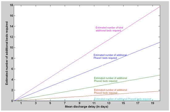 Figure 13. The estimated number of additional beds required in each phase of the stroke care unit with respect to the mean discharge delay (after 1000 days).
