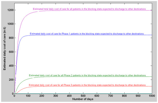 Figure 21. The estimated daily cost of care for patients in the blocking state of each phase expected to be discharged to other destinations (for mean discharge delay τ = 10 days).