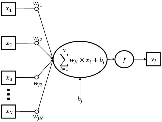 For example, there are two common layers in all CNN models; convolution (CONV) and fully connected (FC). In both layers, the scalar product (MAC) is the core in their computations. Both layers use the scalar product to multiply inputs with weights (filter elements for the convolution layer), and then accumulate the results into one value. In the CONV layer, a sliding window (filter) is moved over the input data, calculating the scalar product between the selected inputs and the filter. Similarly, one FC layer is constructed with multiple neurons, each of which calculates the scalar product between the inputs and the weights, adding a bias and then using the result in the activation function to produce an output. As a demonstration, the calculation of one neuron in the FC layer of an artificial neural network (ANN) is presented in Equation (1) and illustrated in Figure 1.