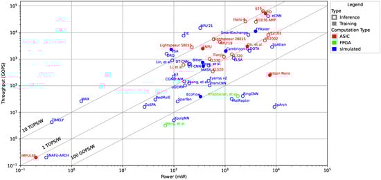 Compared to a similar graph by Reuther et al. [,,], we can observe that the recent accelerators stay mostly around the trendlines for a power efficiency between 100 GOPS/W and 10 TOPS/W, which is inline with previous studies. There is, however, a homogeneity we can see in the data. The low-power accelerators tend to have a power consumption above ≈100 mW and a throughput above ≈1 GOPS; few accelerators lay beneath these thresholds. Further, we can observe that ASIC implementations in general have a better power efficiency than FPGA implementations, which is expected. Finally, we can observe that the majority of the surveyed accelerators target only inference. A possible explanation for that is that many low-power accelerators target edge or mobile devices, where a pre-trained model is used and only inference needs to be done.