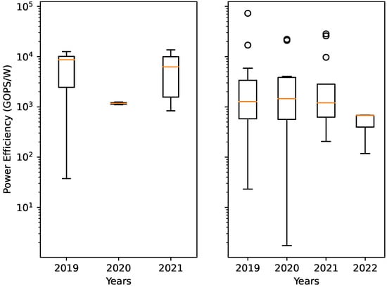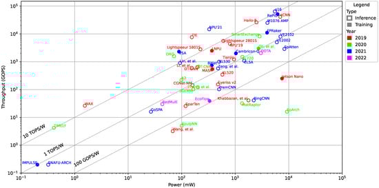 As a foundation to base our results on, we compare our data with the conclusions and findings found in the surveys by Reuther et al. [,,]. In Appendix A, and in Table A1, Table A2, Table A3 and Table A4, all reviewed low-power AI accelerators from the last four years are presented.