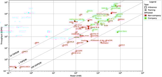 Power (mW) vs. throughput (GOPS) scatter plot of low-power AI accelerators at logarithmic scales. The colors represent an accelerator’s affiliation: company (green) or non-company (red) affiliated accelerator.
