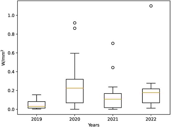 In Figure 7, we can observe that there has not been much change with regard to power per square milliliter; there is an overall increase. The reason for this increase is related to the power consumption, i.e., there is an increase in power consumption every year for all accelerators, independent of the accelerator’s affiliation.