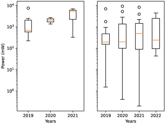 For the company affiliated accelerators, the increase in power consumption is substantial, as shown in Figure 8, with a peak in 2021 (company affiliated accelerators from 2022 is missing from our data set). It increases every year, excluding NVIDIA’s Jetson Nano [] from 2019, which has the highest overall power consumption reported. Meanwhile, non-company affiliated accelerators have not had such a clear increase in power over the years.