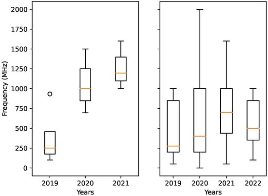 The next aspect that we would like to observe is to take a deeper look into the relationship between power and area. In Figure 7, the ratio of power vs. area over the years is plotted. In Figure 7, Figure 8 and Figure 9, the red line denotes the median, the box represents the interval between the first quartile () and the third quartile (). The boundaries of the whiskers are based on  IQR, where the interquartile range (IQR) is defined as IQR . The rings outside the whiskers are outliers.