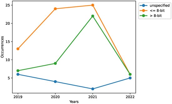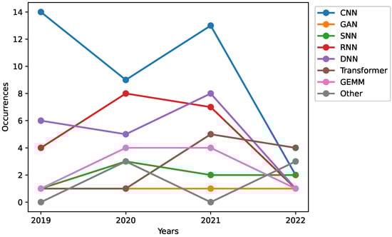 A more recent addition to these targets are Transformers, that were introduced in 2017 with the paper by Vaswani et al. []. As shown in Figure 10, the use of Transformer as the acceleration target for low-power AI accelerators increased in 2021 compared to previous years. In our opinion, this is attributed to the slow transition into the low-power domain for Transformer models.