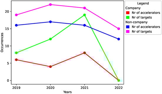 Number of acceleration targets per year. Divided into company and non-company (research) acceleration targets. Note that an accelerator can accelerate more than one target.